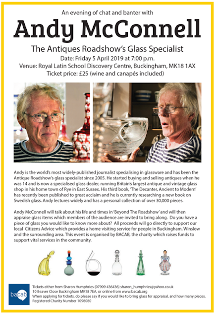 Last night Julie and I went along to the Royal Latin School to listen to Andy McConnell of Antiques Roadshow fame. (He is their resident glassware specialist, we were told.) It was a fundraising evening for BACAB which supports the local Citizens Advice service. Neither Julie nor I are particularly into antiques and (dare I say this) do not tend to watch the BBC programme on Sunday evenings (unlike six million other people apparently). So we went expecting a couple of glasses of wine, a canapé or three, chat with some of the good people of the Town and (we thought) a fairly tedious presentation about antique glassware. How wrong I was!